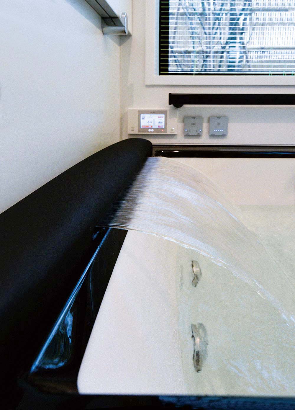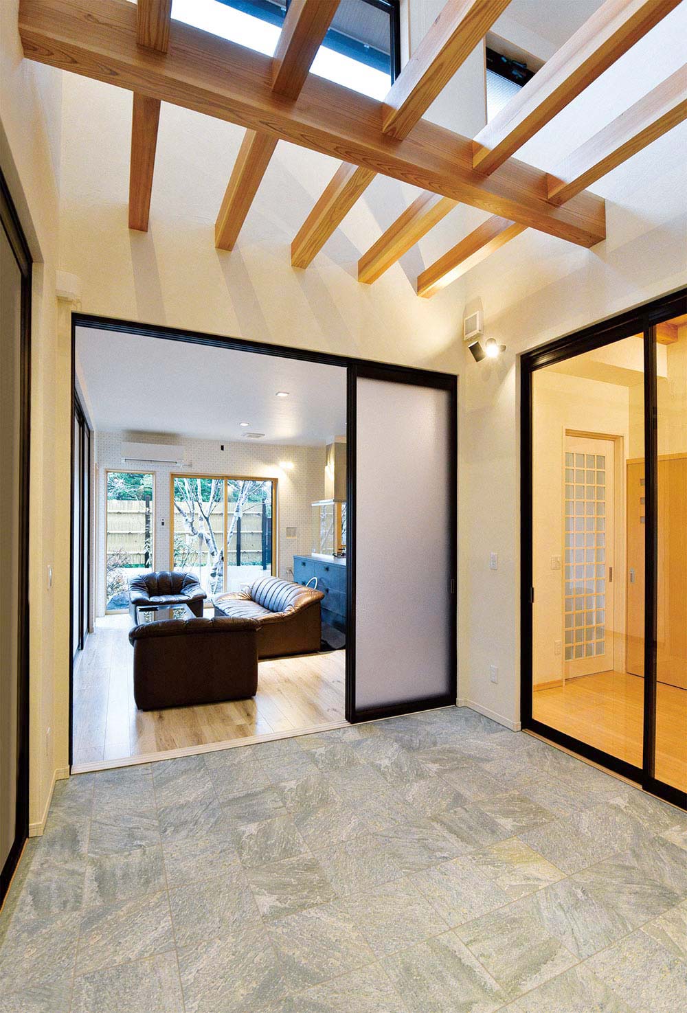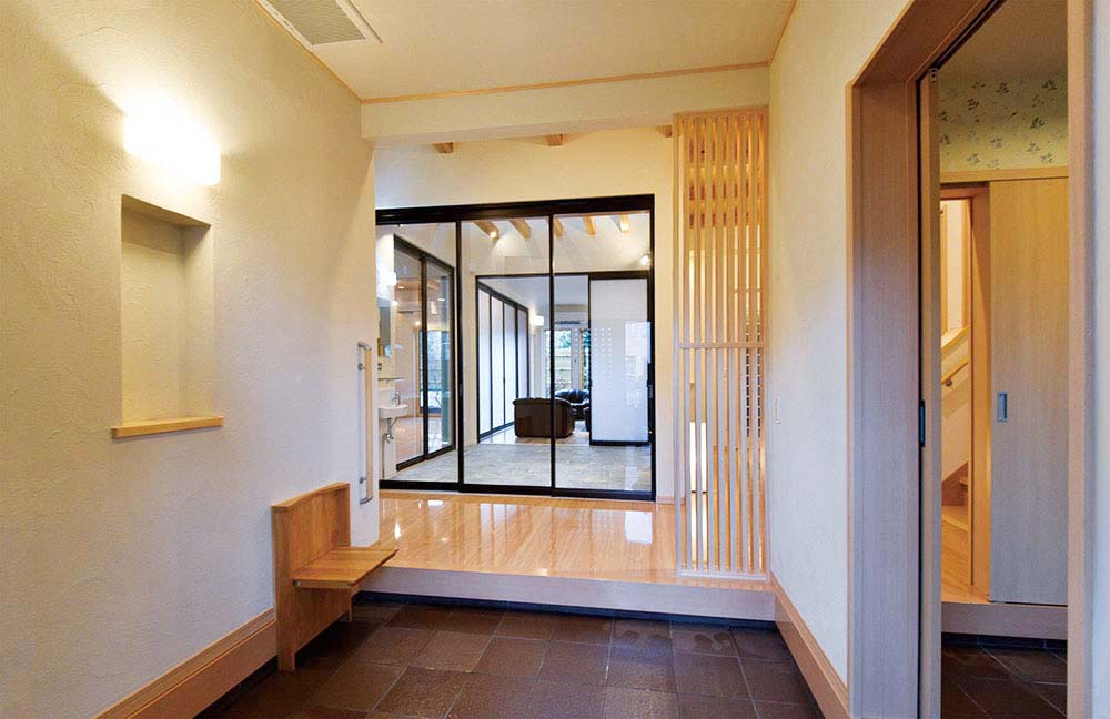 鳥取県産の杉をふんだんに使用、収納も専属大工が手作り。アイボリーの壁は調湿性のある珪藻土です。家の中央に吹き抜けを配したことで住まい全体が明るく、どの部屋へもアプローチしやすくなっています。
