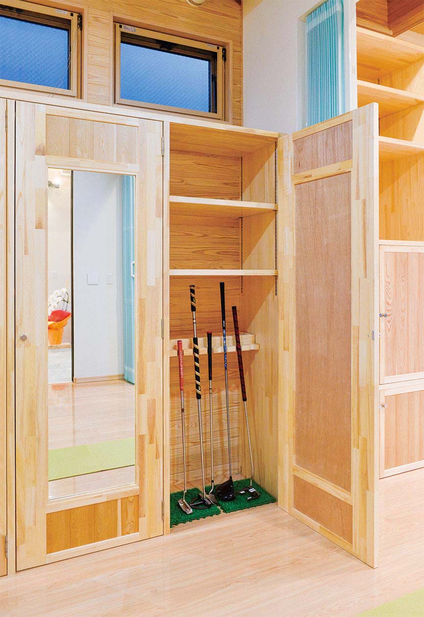 リビングの隣にゴルフスペースを設け、思いっきりスイングできる天井高を確保。床にはカップを埋め込み、パター練習もできるようにしました。窓が多いLDKは開放感にあふれ、大勢が集まっても余裕が感じられます。